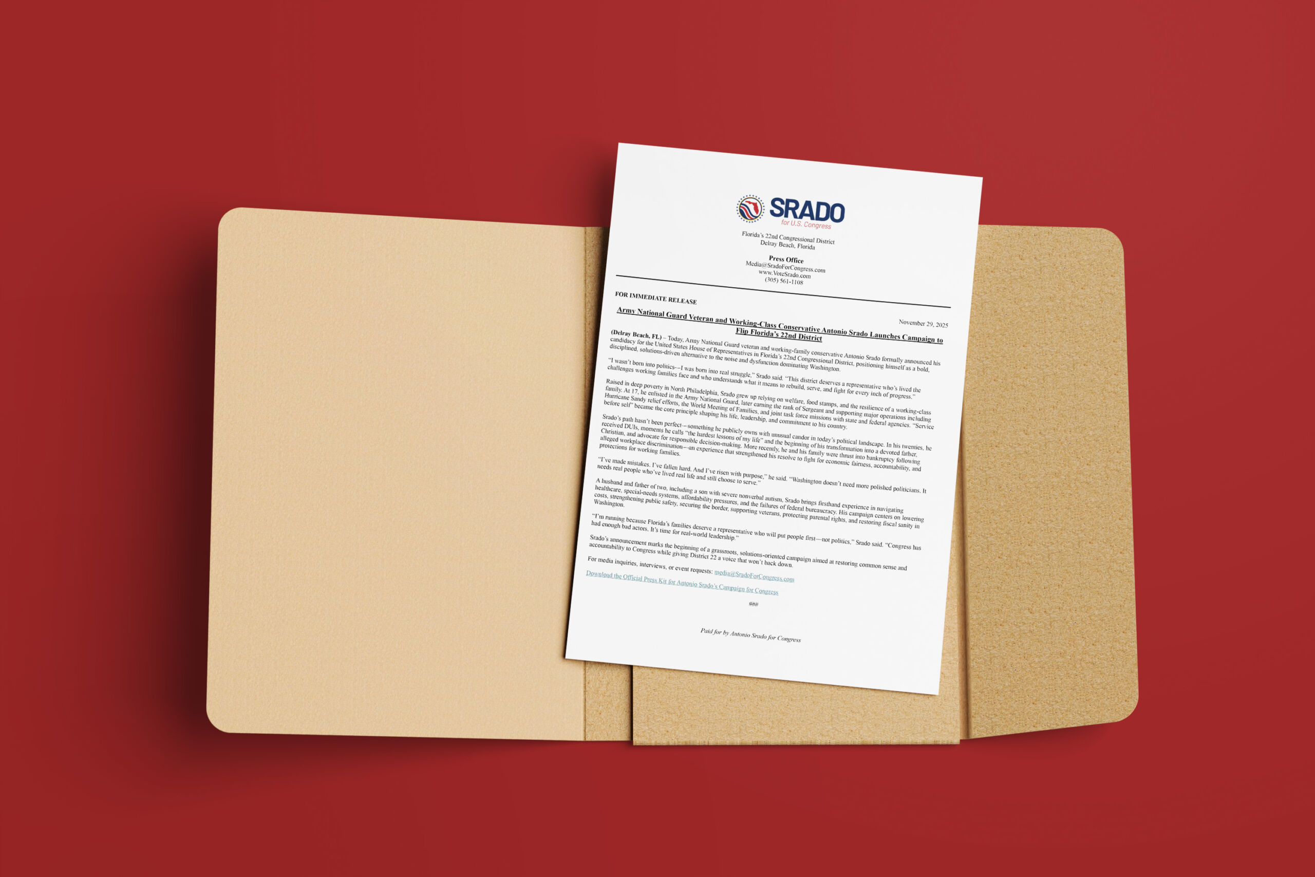 (Delray Beach, FL) – Today, Army National Guard veteran and working-family conservative Antonio Srado formally announced his candidacy for the United States House of Representatives in Florida’s 22nd Congressional District, positioning himself as a bold, disciplined, solutions-driven alternative to the noise and dysfunction dominating Washington.